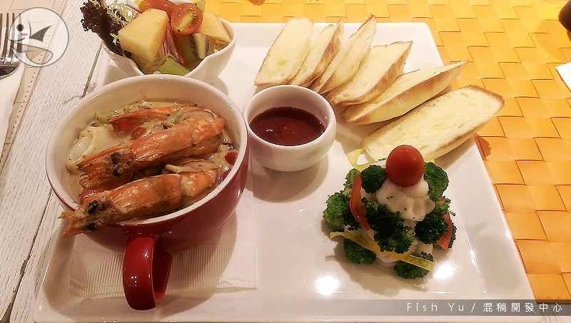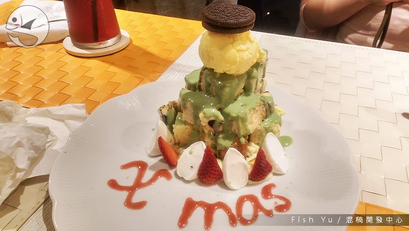 這次來吃的是聖誕套餐,盤子上還寫了「Xmas」的字樣,整體造型也有點像棵聖誕樹。