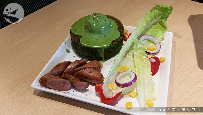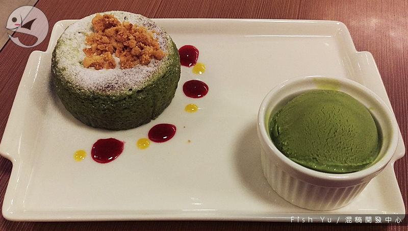 熔岩蛋糕真不是蓋的,外皮感覺僅有薄薄一層,用湯匙輕輕一劃,抹茶內餡就如同字面上的意思一般一湧而出!而蛋糕外皮微微酥脆,沾著抹茶內餡一起食用,味道很棒。