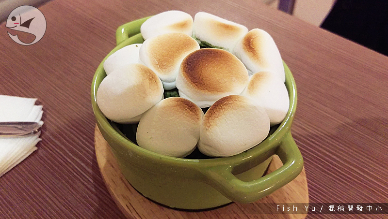 些微焦酥的棉花糖外皮實在教人難以招架,中間放了掰成碎片的鹹味餅乾(看份量應該是一片),底部的抹茶冰淇淋裡還有蛋糕底和小塊水蜜桃,一份點心,結合了冷與熱的元素,特殊的不只是味道,還有巧思。