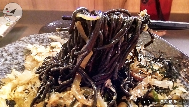 美乃滋和其他醬料的味道還滿濃郁的料理,比較特別的是麵條本身是黑暗的拉麵。
