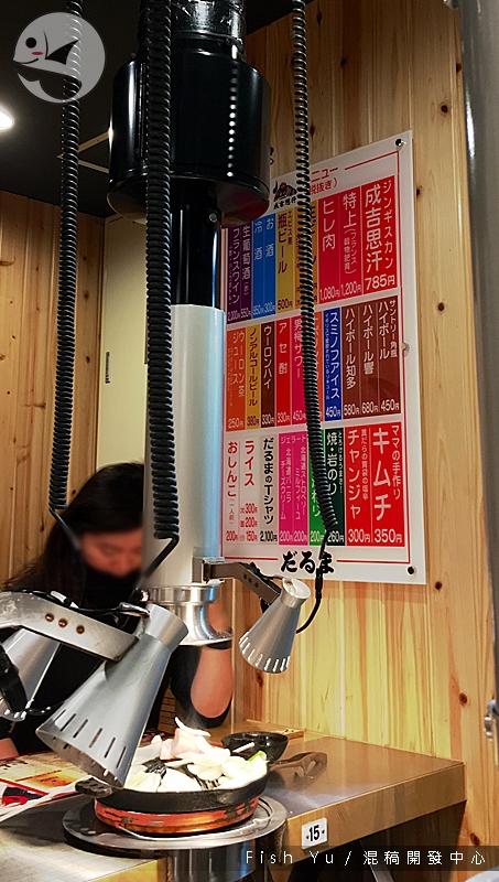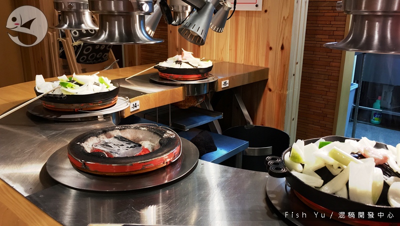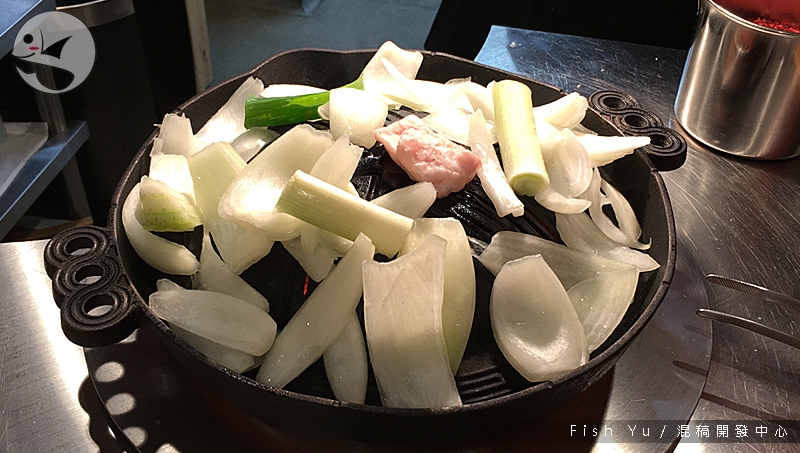 一開始會先上烤蔬菜,鐵板頂端放有一塊肥肉當作油脂,香氣和油煙一下就大爆發,又因為鐵板很燙,不快點翻面,洋蔥很快就會焦掉。