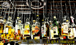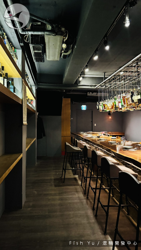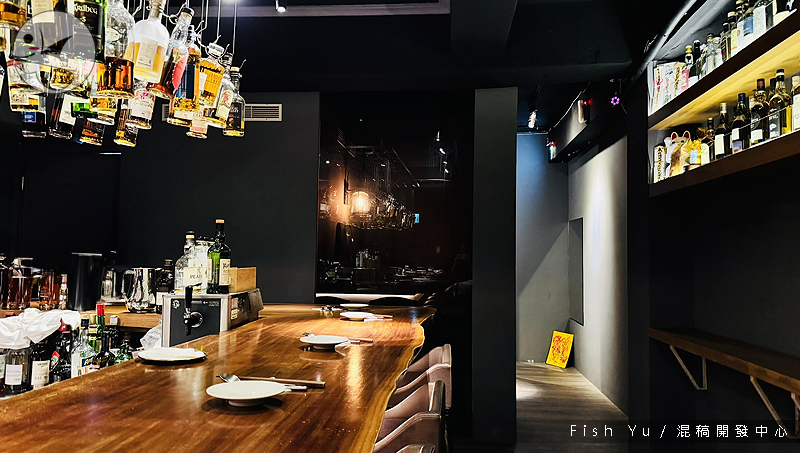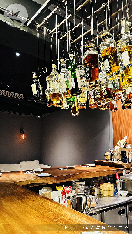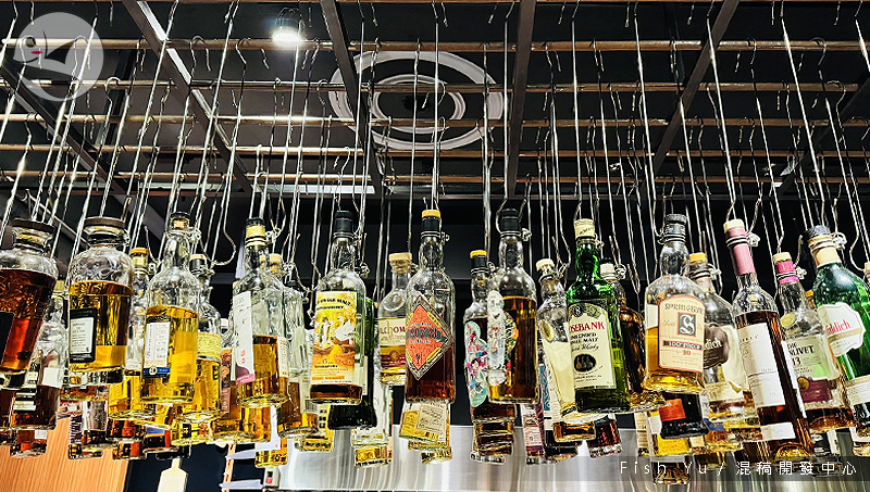 吧台上方懸吊著各式酒類,主要是威士忌。