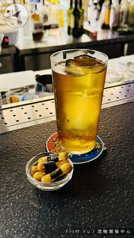 隨酒附上一小碟品川卷,酒體帶有濃厚的鐵觀音茶香與茶感,又帶點通寧水的微苦甜與氣泡口感,我還挺喜歡,酒感中等偏輕。