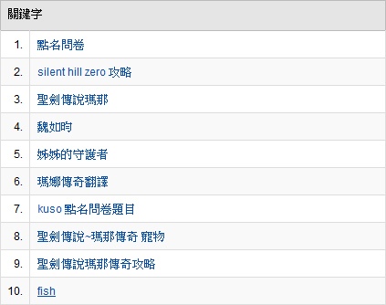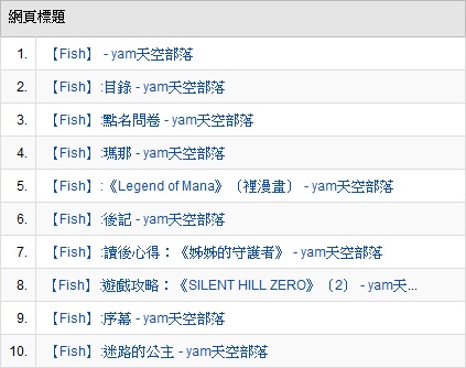 其中以《聖劍LOM》相關的搜尋佔掉4個,這我不意外,Silent Hill竟然也佔了一個,我的名字「Fish」也佔了一個,是讓我有一點小驚訝。不過其他的我可就覺得很冏了……