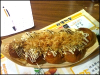 放在店內的看板上,自然是店內主要商品的照片,說實在的確很吸引人,不過嚇住我的是價錢──媽啊,最便宜的也要120元,實在滿貴耶。不過既然人都站在這裡了,豈可空手而回(因為肚子餓啦)?所以我當然就買了一份章魚燒啦。