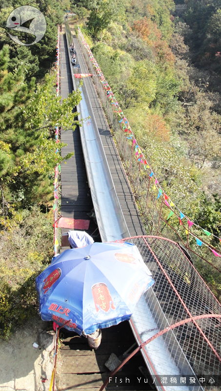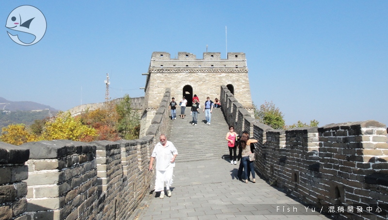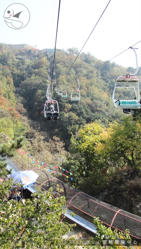 長城上頭並不好走,有些段落像走山路一樣崎嶇不平,但長城真是了不起的歷史建築,綿延不絕。要上長城,必須先穿越一大段山路,等人爬上來大概就去了半條命了。幸好在我們上山的計程車司機告知上山有纜車可以搭、下山有滑坡道可以溜,這可足足省卻我們好幾個小時的跋涉,還增加了很有意思的體驗。
