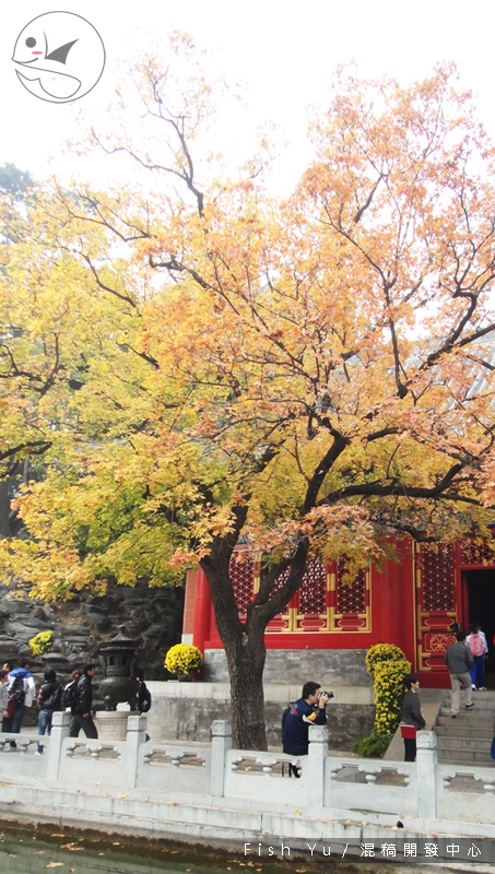 一下車真的讓我們超傻眼,除了人山人海以外,紅葉根本沒幾株,入口處有攤販在撈水池上的紅葉要拿來賣,園內只要是靠近道路的樹幾乎都被拔光了葉子,垃圾更是四處可見,不少圍起來禁止進入的區域照樣爬滿了人,這樣還可以被評為「首都文明單位」,真的是,呵呵(白眼)。