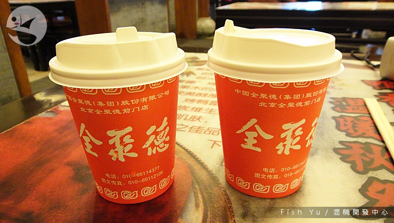 來訪全聚德的時間,正值該店販售「午茶套餐」的時段,這時出的餐都只是點心份量,而非正餐的料理,連餐具都是塑膠盤和紙杯;但是鴨肉真的是名不虛傳地好吃。