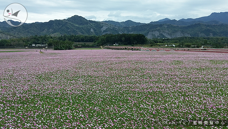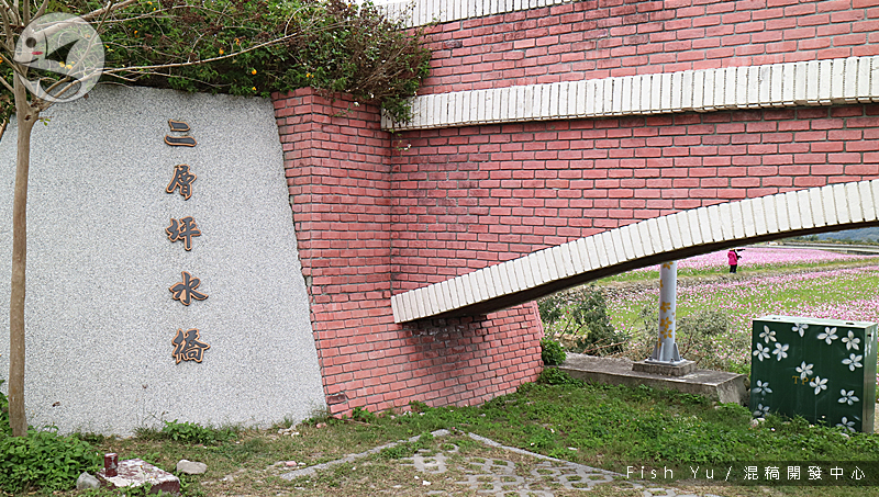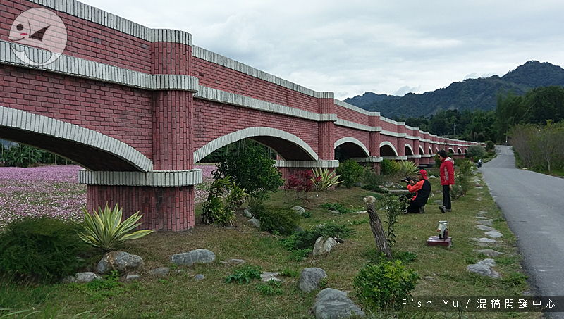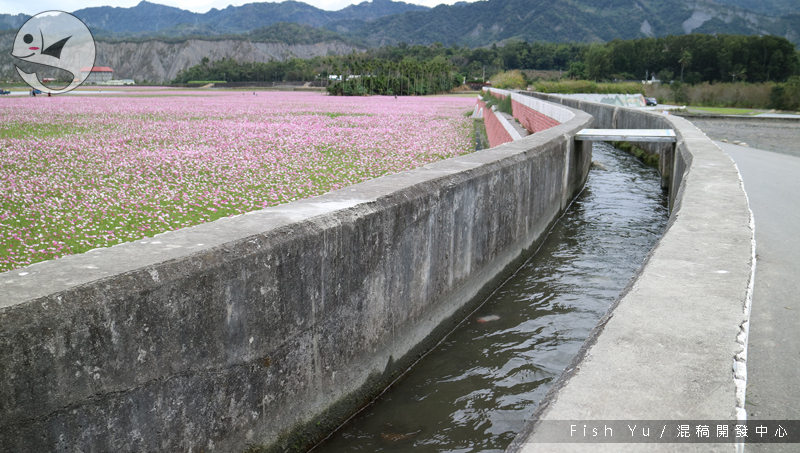 這裡有幾乎一望無際的波斯菊花田,有桃紅、粉紅與白色的花朵相間,經過改建的水橋本體已經失去古老的風貌,一旁的水圳還有水上流的奇觀。
